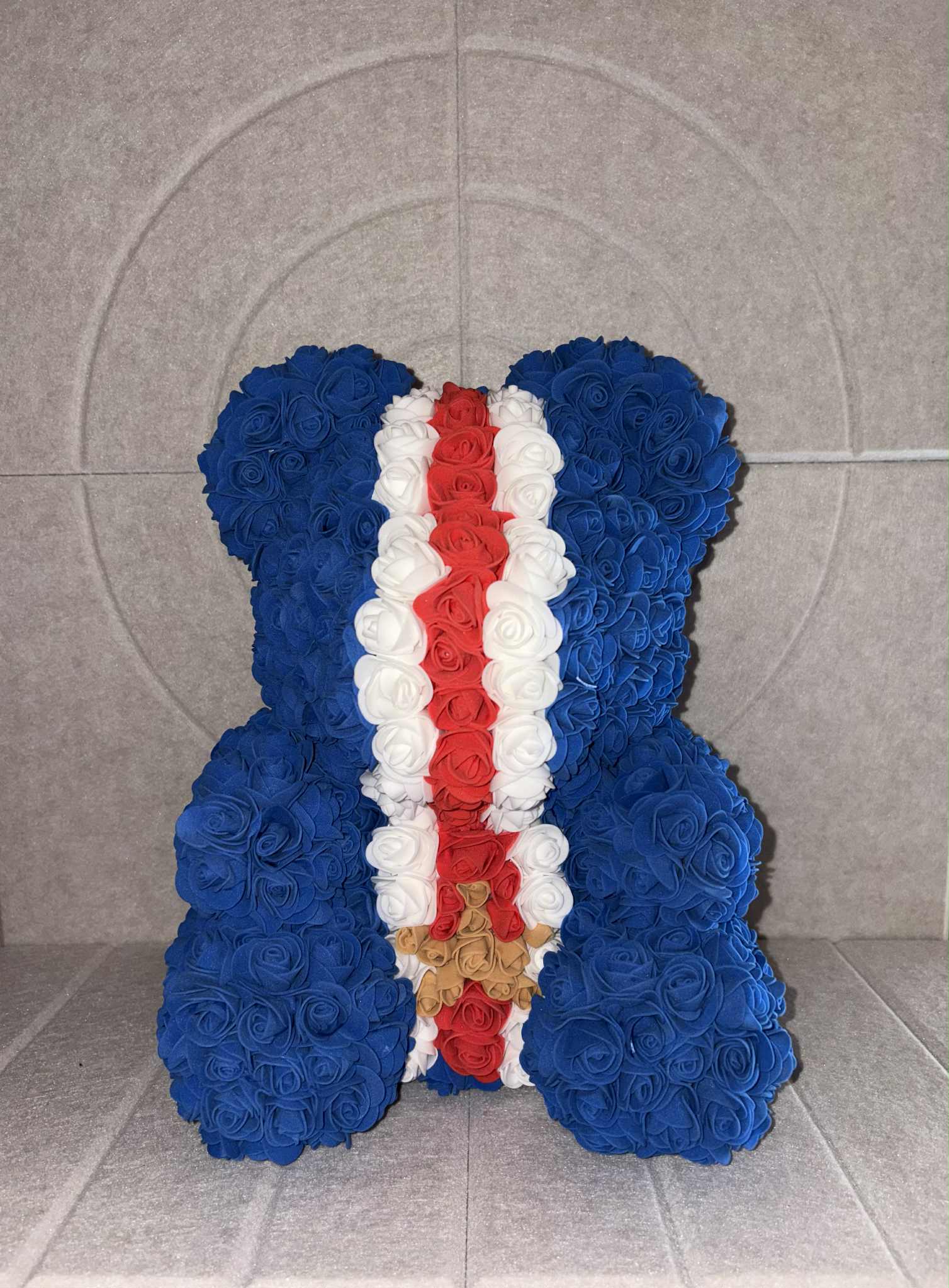 Le nounours ne retient presque pas la poussière grâce aux roses artificielles utilisées. Un léger dépoussiérage de temps en temps suffit.Création artisanale: